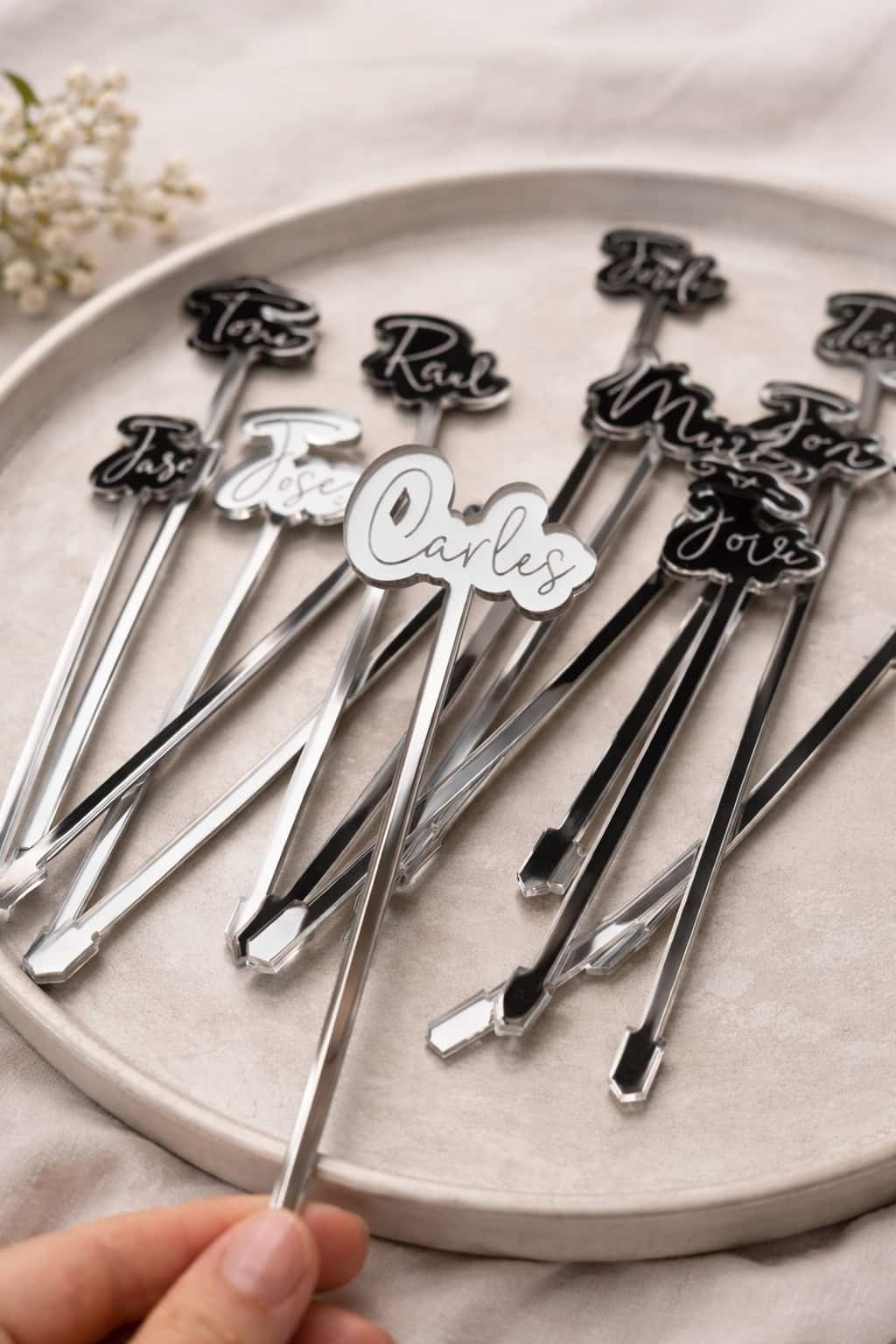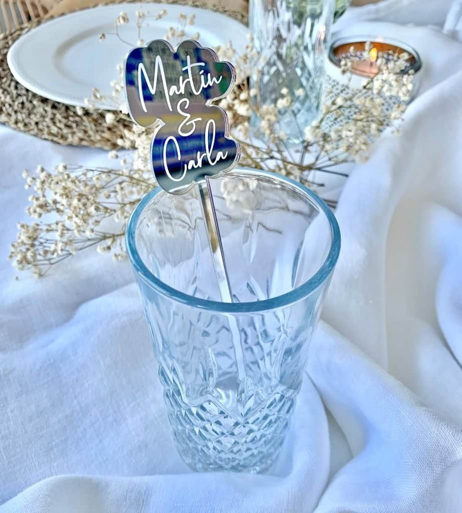 Los agitadores ó removedores estilo Martín, los hemos diseñado con dos características. Color plateado espejo y con los nombres en cada agitador, respetando la forma de cada nombre, como puedes ver por ejemplo en una de las imágenes de producto, donde aparecen distintos agitadores.