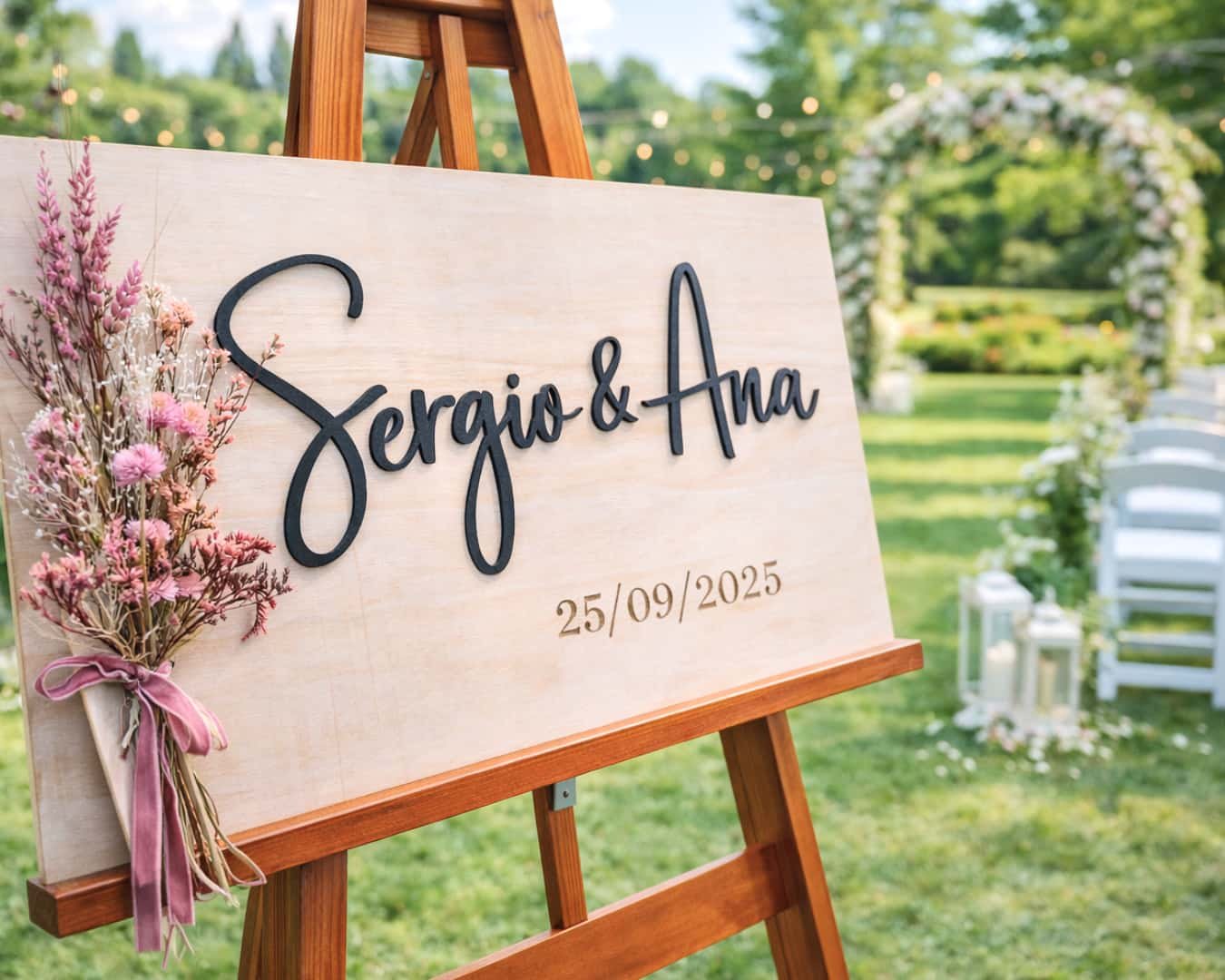 Incluirá los nombres de la novia y el novio, así como un grabado en madera con la fecha del evento.