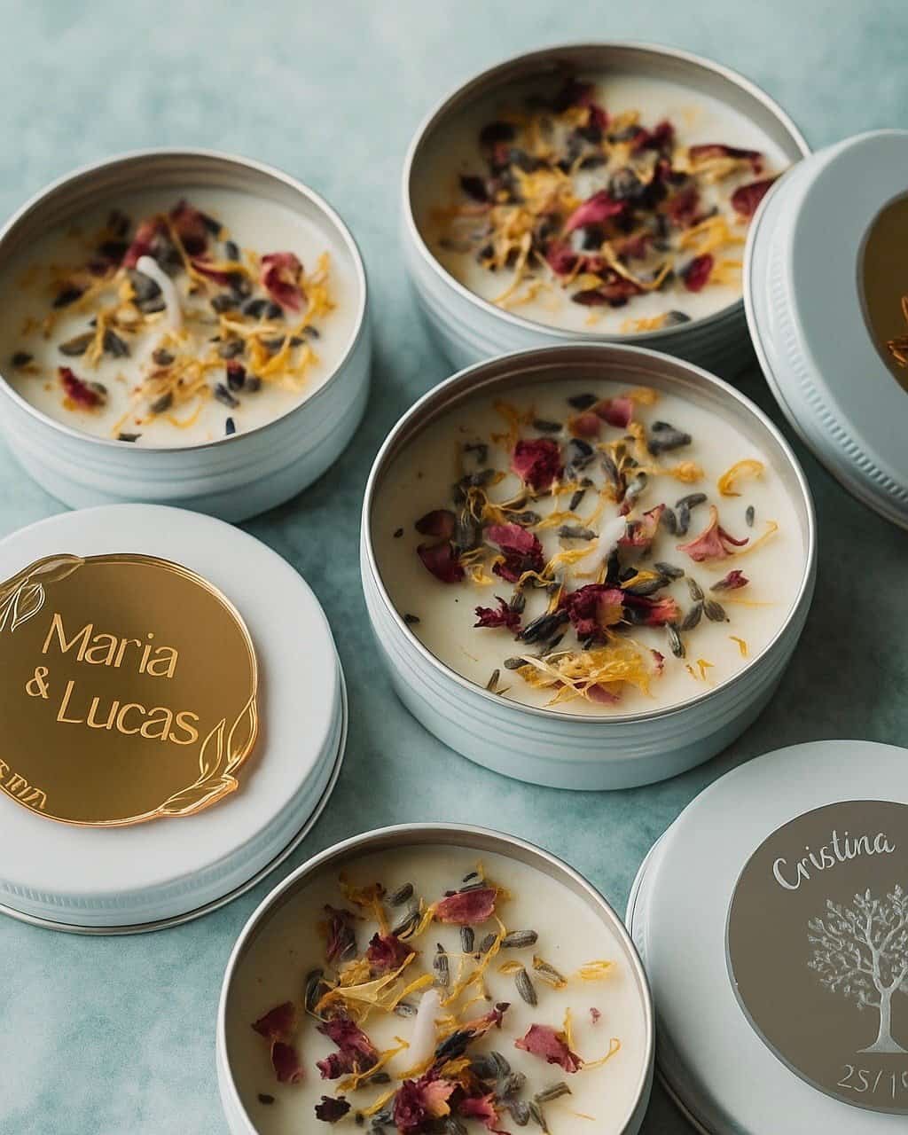 Haz que tus invitados se lleven un pedacito de vuestro gran día con nuestras velas artesanales de cera de soja 100% natural, decoradas con delicadas flores preservadas y un detalle que marca la diferencia.